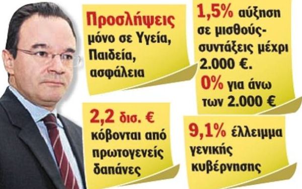 Πάγωμα προσλήψεων το 2010 στο Δημόσιο, με εξαίρεση σε Υγεία, Παιδεία και ασφάλεια, αλλά και μηδενικές αυξήσεις για μισθούς και συντάξεις πάνω από 2.000 ευρώ αποφάσισε χθες το υπουργικό συμβούλιο στέλνοντας για εκτύπωση τον προϋπολογισμό του 2010 με περικοπές πρωτογενών δαπανών 2,2 δισ. ευρώ (Υπενθυμίζεται ότι και φέτος μισθοί και συντάξεις άνω των 1.500 ευρώ, δεν πήραν αύξηση).