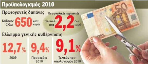 Στόχος να πέσει το έλλειμμα στο 9,1% έναντι 9,4% του προσχεδίου και 12,7% φέτος, μετά και τις τελευταίες αυστηρές συστάσεις της Ευρωπαϊκής Επιτροπής στον υπουργό Οικονομικών Γιώργο Παπακωνσταντίνου, ο οποίος φέρεται να ξεκαθάρισε πως δεν υπάρχουν περιθώρια, αλλά ο προϋπολογισμός του 2010 «είναι εργαλείο της κυβέρνησης για να δείξει ποια είναι η οικονομική πολιτική που θα ακολουθήσει και η οποία βασίζεται στην ανάταξη της οικονομίας και στην αναδιανομή των εισοδημάτων και των βαρών».