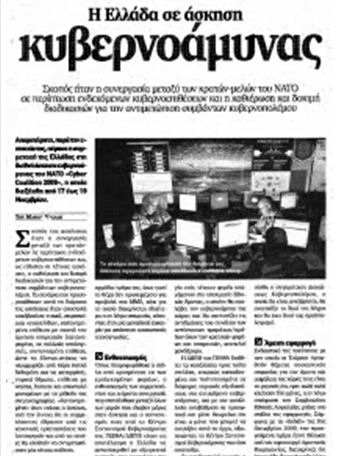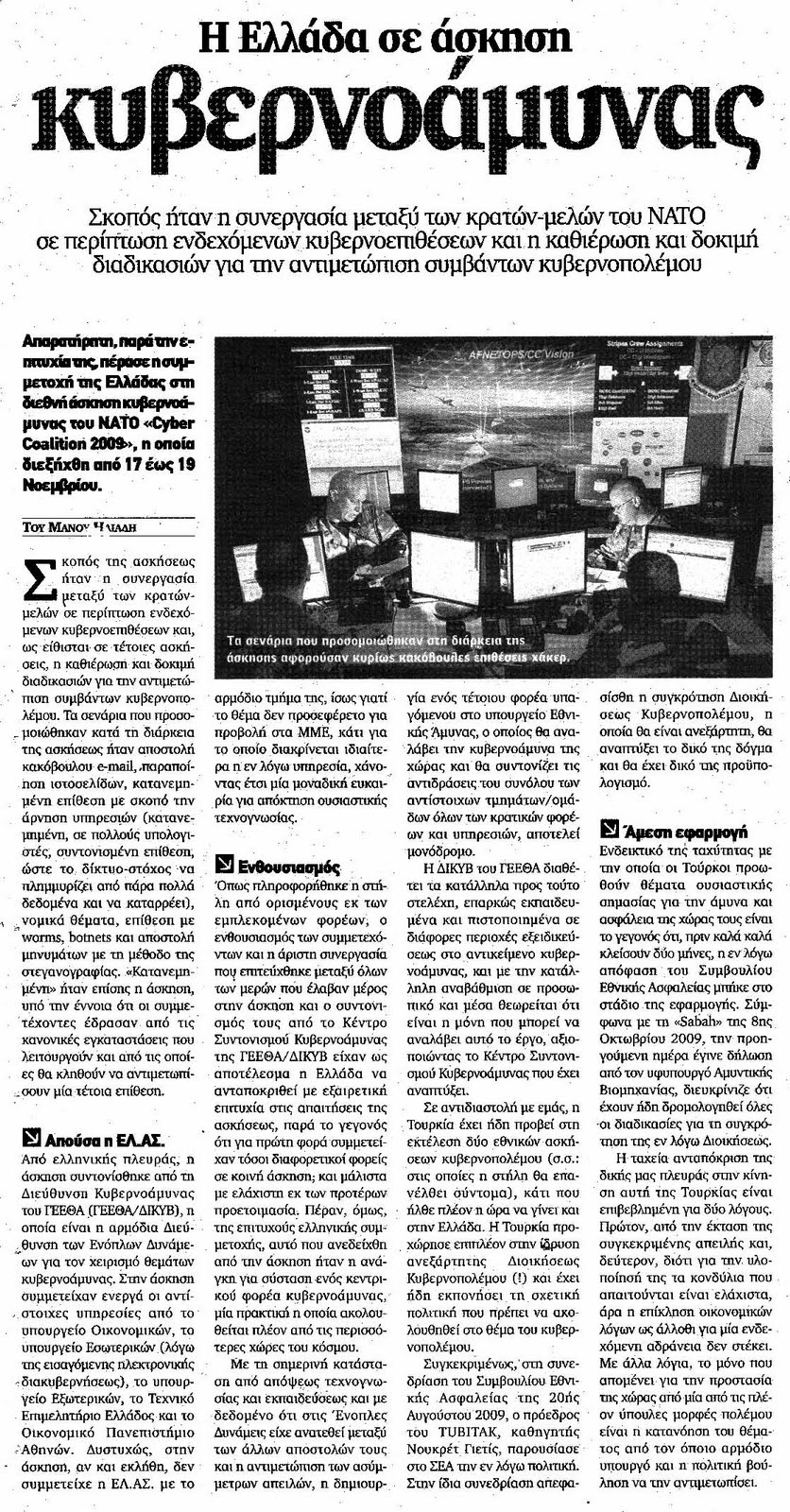 Η Ελλάδα σε άσκηση κυβερνοάμυνας. Posted on 28 Νοεμβρίου, 2009 by Λουκάς Σχολιάστε Απαρατήρητη παρά την επιτυχία της, πέρασε η συμμετοχή της Ελλάδας στη διεθνή άσκηση κυβερνοάμυνας του ΝΑΤΟ “Cyber Coalition 2009” η οποία διεξήχθη από 17 έως 19 Νοεμβρίου. Του Μάνου Ηλιάδη Κλικάρετε για μεγένθυση Κοινοποιήστε:Tweet Στείλε ένα σύνδεσμο σε έναν φίλο(Ανοίγει σε νέο παράθυρο) Email Εκτύπωση(Ανοίγει σε νέο παράθυρο) Εκτύπωση Μου αρέσει! Φόρτωση... Σχετικά
