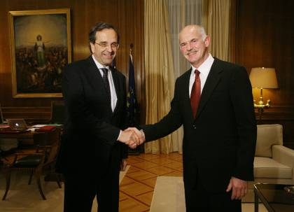 «Σε άλλα θέματα θα είμαστε μαζί και σε άλλα απέναντι», δήλωσε ο Αντώνης Σαμαράς, οριοθετώντας τη σχέση του με τον Γιώργο Παπανδρέου και την κυβέρνηση. Ο νέος πρόεδρος της Νέας Δημοκρατίας, επισκέφτηκε το απόγευμα το Μέγαρο Μαξίμου, ύστερα από πρόσκληση του πρωθυπουργού. «Προσβλέπουμε σε στενή συνεργασία και στα εθνικά θέματα, γιατί έχουν διογκωθεί τα προβλήματα και χρειάζεται διάλογος και συναίνεση», δήλωσε από τη μεριά του ο Γ. Παπανδρέου.Ο Αντ. Σαμαράς διευκρίνισε ότι κυβέρνηση και αξιωματική αντιπολίτευση θα είναι μαζί, επειδή υπηρετούν την ίδια κοινωνία και έχουν τους ίδιους στόχους, δηλαδή την ευημερία του λαού. Πρόσθεσε ότι θα είναι απέναντι επειδή υπηρετούν διαφορετική ιδεολογία, αλλά και επειδή αυτό επιβάλλεται και αρμόζει στον θεσμικό ρόλο της αξιωματικής αντιπολίτευσης. Σχολιάζοντας το γεγονός ότι τους δύο άνδρες συνδέει πολυετής φιλία -ήταν συγκάτοικοι στο πανεπιστήμιο- ο πρόεδρος της Ν.Δ. τόνισε ότι το να είσαι φίλος δεν σημαίνει ότι δεν μπορεί να είσαι πολιτικά αντίπαλος. «Όταν χρειαστεί θα είμαστε πολύ σκληροί απέναντι στην κυβέρνηση», υποσχέθηκε.