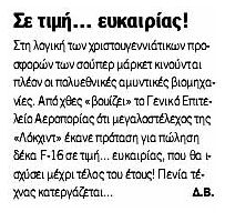 LOL ! Ειδαν τα δυσκολα τωρα και κανουν εκπτωσεις οι «φιλοι» μας ! Φιλε Λουκα , λενε τι ειδος F16 ειναι η δεν ειναι μονο η τιμη ευκαιριας και ειναι μεταχειρισμενα ? Ολα να τα περιμενεις απ’αυτους !