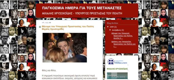 Νέο blog: Παγκόσμια ημέρα για τους μετανάστες. Posted on 20 Δεκεμβρίου, 2009 by Λουκάς 2 Σχόλια Ο Υπουργός Προστασίας του Πολίτη Κος Μιχάλης Χρυσοχοϊδης έγινε blogger. Ο Θεός να βάλει το…χέρι του. Κλικάρετε την εικόνα για μία…επίσκεψη. Κοινοποιήστε:Tweet Κλικ για αποστολή ενός συνδέσμου μέσω email σε έναν/μία φίλο/η(Ανοίγει σε νέο παράθυρο) Email Κλικ για εκτύπωση(Ανοίγει σε νέο παράθυρο) Εκτύπωση Μου αρέσει! Φόρτωση... Σχετικά