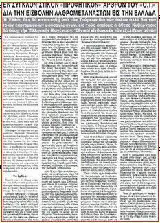 Η Ελλάς δεν θα κατακτηθεί υπό των Τούρκων δια των όπλων αλλά δια των 3 εκατομμυρίων μουσουλμάνων, εις τους οποίους, η άθεος Κυβέρνησις θα δώσει την Ελληνική Ιθαγένεια. Εθνικοί κίνδυνοι εκ’ των εξελίξεων αυτών…
