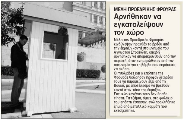 Αρνήθηκαν να εγκαταλείψουν το χώρο. Posted on 11 Ιανουαρίου, 2010 by Λουκάς Σχολιάστε Εφημερίδα ΕΘΝΟΣ – Σελ.20 Κλικάρετε για μεγένθυση ΑΠΟΓΕΥΜΑΤΙΝΗ – ΣΕΛ.2 Κλικάρετε για μεγένθυση ΕΛΕΥΘΕΡΟΣ ΤΥΠΟΣ – ΣΕΛ.3 Κοινοποιήστε:Tweet Κλικ για αποστολή ενός συνδέσμου μέσω email σε έναν/μία φίλο/η(Ανοίγει σε νέο παράθυρο) Email Κλικ για εκτύπωση(Ανοίγει σε νέο παράθυρο) Εκτύπωση Μου αρέσει! Φόρτωση... Σχετικά