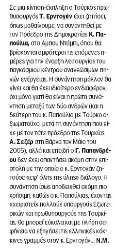 Είχαμε τους Κεμαλοφασίστες, τώρα έχουμε και τους Ισλαμοφασίστες. Αυτοί είναι χειρότεροι. Θέλουν να λυτρώσουν την Τουρκία από τον εθνικοφασισμό του Κεμάλ, και να ενώσουν τις μειονότητές τους υπό το σκέπασμα του διεθνούς Κορανοφασιμού. Ο Ερντογάν έχει άγρια ένστικτα, είναι βίαιος χαρακτήρας, ευερέθιστος, ασταθής, διπολικός (κλαίει και αγριεύει με ευκολία), και κατα την εκτίμησή μου είναι και ο ίδιος προσωπικά πίσω από την εκταφή του Παπαδόπουλου. Ο Παπούλιας είναι γέρος και ήπιος χαρακτήρας. Ο Παπούλιας στην συνάντηση πρέπει να πάει με σωρεία αιτημάτων, που καμία σχέση δεν θα έχουν με το Κυπριακό, και που θα έχουν να κάνουν με περιοχές στην Τουρκία όπου δεν υπάρχει πλέον ελληνικό στοιχείο, αλλά με αρχαιοελληνική και βυζαντινή ιστορία. Τα αιτήματα του Παπούλια μπορούν να έχουν να κάνουν με ανέγερση μουσείων, αναπαλαίωση κτηρίων, ανάδειξη αρχαιολογικών χώρων. Πρέπει να εγείρει αξιώσεις για ζητήματα τα οποία θα εξοργίσουν τον Ερντογάν. Ο Ερντογάν θυμώνει εύκολα. Σε κάθε συνάντηση με Έλληνα, στόχος πρέπει να είναι η εξόργιση του Ερντογάν. Ο Ερντογάν είναι διαολισμένος με το Κυπριακό, του είναι αγκάθι. Το ζήτημα είναι η περαιτέρω πίεση του Ερντογάν και της Τουρκίας. Ο Ερντογάν θα το κάνει το μεγάλο λάθος μετά από παρατεταμένους εξοργισμούς. Με τα σημερινά διεθνή δεδομένα, τυχόν σύρραξη Ελλάδος Τουρκίας θα επιφέρει την καταστροφή της Τουρκίας. Ο αντι-ισλαμισμός στην Ευρώπη και Αμερική θα εκραγούν. Ενώ η Τουρκία ίσως μεσοπρόθεσμα κερδίσει κάποια νησιά ή άλλα εδάφη, μακροπρόθεσμα θα διαλυθεί από τους πάντες. Από εδώ και στο εξής, παρά την διάλυση της οικονομίας μας, στα εθνικά μας έχουν αντιστραφεί οι όροι, λόγω της διεθνούς συγκυρίας. Δεν υπάρχει κανένας λοιπόν λόγος ο Παπούλιας να μην εξοργίσει τον Ερντογάν, και να μην ζητάει διαρκώς.