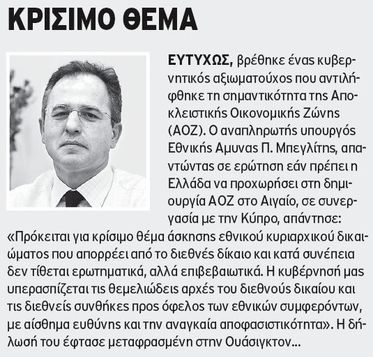 Η Ελλάδα πρέπει να προχωρήσει στη δημιουργία ΑΟΖ στο Αιγαίο σε συνεργασία με τη Κύπρο. Posted on 23 Ιανουαρίου, 2010 by Λουκάς Σχολιάστε ΕΘΝΟΣ – ΣΕ.10 Κοινοποιήστε:Tweet Κλικ για αποστολή ενός συνδέσμου μέσω email σε έναν/μία φίλο/η(Ανοίγει σε νέο παράθυρο) Email Κλικ για εκτύπωση(Ανοίγει σε νέο παράθυρο) Εκτύπωση Μου αρέσει! Φόρτωση... Σχετικά