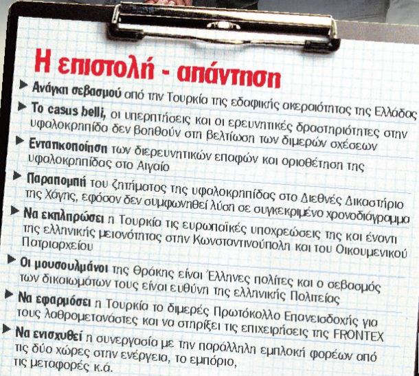 Στην έκτασης 5 σελίδων επιστολή, ο κ. Παπανδρέου αναφέρεται σε σειρά ζητημάτων. Για το Αιγαίο τονίζει ότι ενέργειες όπως το casus belli, οι υπερπτήσεις και οι ερευνητικές δραστηριότητες στην υφαλοκρηπίδα, που δεν έχει ακόμη οριοθετηθεί σύμφωνα με το Δίκαιο της Θάλασσας, «δεν βοηθούν τη βελτίωση των σχέσεων». Εκτός από την πρότασή του για αναζωογόνηση των διερευνητικών, επαναλαμβάνει την ετοιμότητα της ελληνικής πλευράς να εξετασθούν μέτρα που θα μπορούσαν να συμβάλουν στη μείωση της έντασης, υπό την προϋπόθεση ότι δεν προκαταλαμβάνουν τις πολιτικές και νομικές θέσεις των δύο πλευρών. Τονίζει δε ότι ο μόνος τρόπος για την ενίσχυση της ασφάλειας στο Αιγαίο είναι η αποφυγή στρατιωτικών δραστηριοτήτων που τροφοδοτούν ένταση.