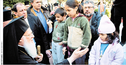 Ένα μικρό παιδί σπρώχνεται από τη μητέρα του κάτω από τα πόδια των αστυνομικών και στέκεται- τσουπ!καμαρωτό μπροστά στον Πατριάρχη. Δεν μιλά λέξη ελληνικά και ο Βαρθολομαίος, όσο πιο φιλικός μπορεί, τον ρωτά: «Ρakistan?». Χαρούμενος που κάποιος ξέρει τη χώρα του ο πιτσιρικάς αρπάζει την εικονίτσα και τρέχει στη μαντιλοφορούσα μαμά του. Δύο μεγάλες σακούλες γεμάτες με τρόφιμα και γρήγορο βήμα προς την έξοδο. «Πάνε να φάνε στο σπίτι, έχει πολλά παιδιά» μου εξηγούν οι πατέρες Ανδρέας και Χρήστος.
