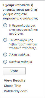 όσους θεωρούν πως υποπίπτουμε στις πρώτες 3 επιλογές της δημοσκόπησης να μας στείλουν ένα μειλ ώστε να μας «φωτογραφίσουν» τα λάθη μας στο:
