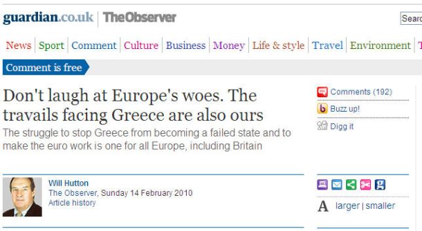 Για ενδεχόμενο πραξικοπήματος στην περίπτωση που η Ελλάδα αφεθεί να χρεοκοπήσει, κάνει λόγο σε σχόλιό του για τον OBSERVER και υπό τον τίτλο «Don’t laugh at Europe’s woes. The travails facing Greece are also ours», o Will Hutton (οποίος έχει επανειλημμένως ταχθεί υπέρ της ένταξης της Βρετανίας στο ευρώ, στον ευρύτατο δημόσιο διάλογο που διεξάγεται στη χώρα.)