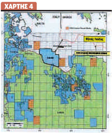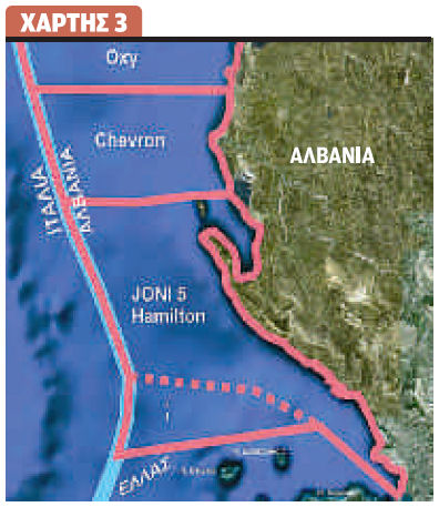 Στον χάρτη 3 παρουσιάζεται ανάγλυφα το πρόβλημα και με ερώτημα οι αλβανικές «καταπατήσεις» του 1994. Η παραχώρηση της Αλβανίας, στο μπλοκ Joni 5, καταπατούσε ξεκάθαρα τη θαλάσσια ζώνη των ελληνικών νησιών. Η Ελλάδα, έπειτα από δημοσιεύματα του Τύπου, αντέδρασε με διαβήματα.