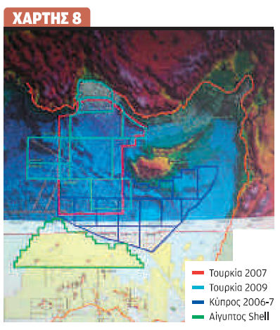 Αν δε, συγκρίνουμε τους χάρτες 8 και 9, τότε αναδεικνύεται η επιθετική πολιτική της Τουρκίας και η χρησιμοποίηση των ερευνών πετρελαίου και της κρατικής εταιρείας της, ΤΡΑΟ, στην άσκηση της επεκτατικής πολιτικής της. Από την άλλη φαίνεται η απουσία πολιτικής από την Ελλάδα και η παθητική της στάση, η οποία οδηγεί στη συρρίκνωση των δικαιωμάτων της.