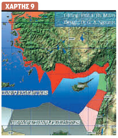 Το πώς όμως θα ήταν οι θαλάσσιες οικονομικές ζώνες της Νοτιοανατολικής Μεσογείου και των χωρών της, αν εφαρμοζόταν το διεθνές δίκαιο της θάλασσας και οι χώρες της περιοχής έδειχναν αλληλοσεβασμό, αυτό φαίνεται στον χάρτη 9 που επιμελήθηκαν οι Θ. Μάζης και Γ. Σγουρός και παρουσίασαν πρόσφατα σε συνέδριο στην Αθήνα. Στον χάρτη φαίνεται ότι η Ελλάδα θα είχε κυριαρχία στην περιοχή και η ΑΟΖ της θα συνδεόταν με την κυπριακή ΑΟΖ. Η Αίγυπτος δεν έχει θαλάσσια οικονομικά σύνορα με την Τουρκία, ενώ σήμερα η Τουρκία φέρεται να διαπραγματεύεται οριοθέτηση τους!