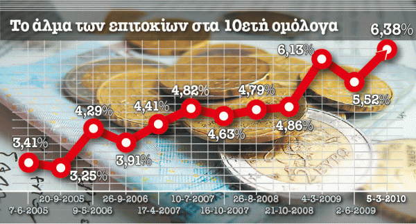 Με επιτόκιο ρεκόρ στο 6,38% δανείστηκε χθες το ελληνικό Δημόσιο 5 δισ. ευρώ μέσω έκδοσης 10ετούς ομολόγου. Μία ημέρα μετά τη λήψη των σκληρών μέτρων και ένα 24ωρο πριν ο πρωθυπουργός Γιώργος Παπανδρέου πετάξει για το Βερολίνο, το υπουργείο Οικονομικών βγήκε στις αγορές. Σύμφωνα με κυβερνητικές πηγές, επρόκειτο για μια «διπλωματική» κίνηση, υπό την έννοια ότι αφενός αποδείχθηκε ότι η Ελλάδα μπορεί να εξυπηρετήσει το χρέος της και αφετέρου πως αυτό ακόμη και μετά τη λήψη μέτρων γίνεται πληρώνοντας…καπέλο.