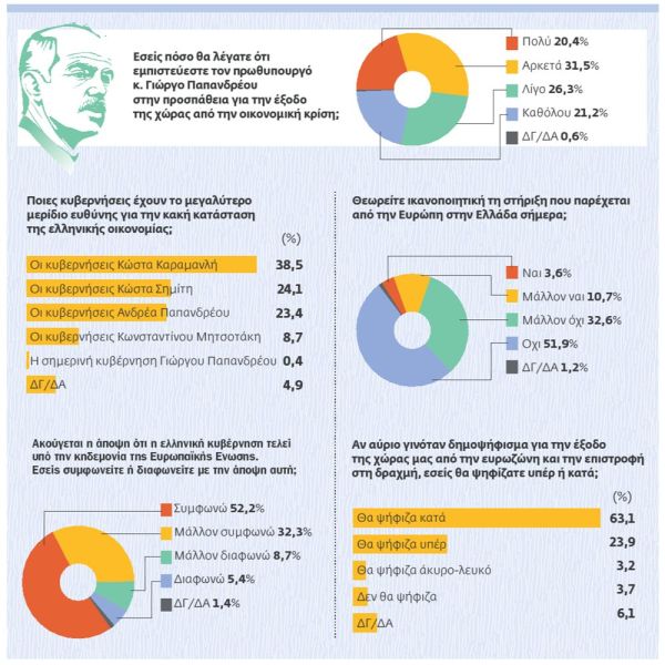 Συντριπτικά υπέρ του Πρωθυπουργού είναι η σύγκρισή του με τον αρχηγό της αξιωματικής αντιπολίτευσης για τα θέματα της οικονομίας. Τον κ. Παπανδρέου δηλώνουν ότι εμπιστεύονται πολύ ή αρκετά το 47,6% των ερωτηθέντων, ενώ τον κ. Σαμαρά το 23,5%. Σε ό,τι αφορά εξάλλου τη δημοτικότητα των ξένων ηγετών στην Ελλάδα, όπως είναι φυσικό πρώτος είναι ο πρόεδρος της Γαλλίας κ. Νικολά Σαρκοζί με 58,9% θετικές ψήφους και ακολουθεί ο πρόεδρος των ΗΠΑ κ. Μπαράκ Ομπάμα με 42,1%. Πρωταθλήτρια στις αρνητικές ψήφους αναδεικνύεται η καγκελάριος της Γερμανίας κυρία Ανγκελα Μέρκελ (85,1%) και ακολουθεί ο κοινοτικός επίτροπος κ. Ολι Ρεν (70,6%).
