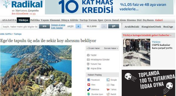 Με αυτό το σχόλιο η τουρκική εφημερίδα «Radikal» αποκαλύπτει ότι οι γείτονές μας βγάζουν στο σφυρί τα δικά τους νησιά για να αντιμετωπίσουν τα προβλήματά τους, που έχουν προκύψει λόγω της οικονομικής κρίσης. Εκτός των νησιών, πολλοί ιδιοκτήτες κολπίσκων έχουν βάλει πωλητήρια. Σύμφωνα με δημοσιεύματα του τουρκικού Τύπου, οι ιδιοκτήτες τριών νησιών που βρίσκονται στο Αιγαίο αναζητούν αγοραστές. Οι ιδιοκτήτες τους είναι μεγάλοι επιχειρηματίες, αλλά στην εποχή της ύφεσης αναζητούν ρευστό. «Και οι Tούρκοι πουλάνε τα νησιά τους», γράφει η εφημερίδα «Aksam», τονίζοντας ότι «την ώρα που η Ελλάδα δέχεται προτάσεις για να πουλήσει τα νησιά της λόγω της κρίσης, στο Μαρμαρά πωλούνται τρία τουρκικά νησιά».