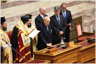 Ολοκληρώθηκε στην Ολομέλεια της Βουλής η τελετή ορκωμοσίας του Προέδρου της Δημοκρατίας Κάρολου Παπούλια για τη δεύτερη θητεία του.Ενώπιον του Αρχιεπισκόπου Ιερώνυμου ο Πρόεδρος της Δημοκρατίας έδωσε το νενομισμένο όρκο για τη δεύτερη θητεία στο ύπατο αξίωμα της χώρας και στη συνέχεια, αφού χαιρέτισε τους πολιτικούς αρχηγούς, κατέθεσε στεφάνι το μνημείο του Αγνώστου Στρατιώτη.Ο Κάρολος Παπούλιας καταλαμβάνει την ένατη προεδρική θητεία από τη μεταπολίτευση, είναι ο τρίτος πρόεδρος μετά τους Κ.Καραμανλή και Κ.Στεφανόπουλο, που επανεκλέγεται σε δεύτερη θητεία, ενώ κατέχει ο ίδιος το ρεκόρ κοινοβουλευτικής συναίνεσης κατά την πρώτη εκλογή του το Μάρτιο του 2005 με 279 ψήφους.