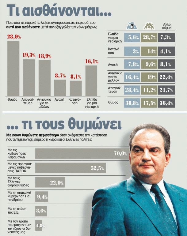 «Θυμός» αλλά και απογοήτευση και ανησυχία είναι οι λέξεις που έρχονται περισσότερο στο στόμα των πολιτών με αφορμή την οικονομική κατάσταση της χώρας και τις θυσίες που οι ίδιοι καλούνται να κάνουν για την έξοδο από την οικονομική κρίση. Μέσα από τον θυμό βλέπουν όμως και τους υπεύθυνους της δημοσιονομικής εκτροπής και το 70% κατονομάζει ως τέτοιους τις κυβερνήσεις Καραμανλή, ενώ το 52,5% τις προηγούμενες κυβερνήσεις ΠΑΣΟΚ.