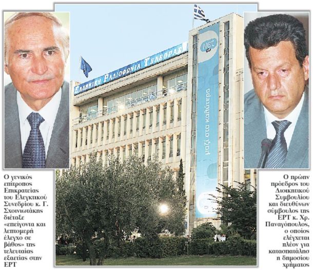 Εκατομμύρια ευρώ που εισπράχθηκαν παράνομα από καρεκλοκένταυρους, «ημετέρους» και κάθε είδους ευνοούμενους στο Ραδιομέγαρο της Αγίας Παρασκευής ζητεί πίσω τώρα το Ελληνικό Δημόσιο. Ο γενικός επίτροπος Επικρατείας του Ελεγκτικού Συνεδρίου κ. Γ. Σχοινιωτάκης διέταξε χθες επείγοντα «λεπτομερή» διαχειριστικό έλεγχο σε «βάθος» για την τελευταία εξαετία στην ΕΡΤ, ώστε να εντοπιστεί κάθε προκλητική δαπάνη και κάθε χρυσοφόρο συμβόλαιο που συνήφθη πέρα από τις προβλέψεις του δημόσιου λογιστικού και να υποχρεωθούν όσοι τα εισέπραξαν να επιστρέψουν τη διαφορά, αφού η δημόσια ραδιοτηλεόραση «ψευδεπίγραφα» εμφανίζεται ως Νομικό Προσωπικό Ιδιωτικού Δικαίου.