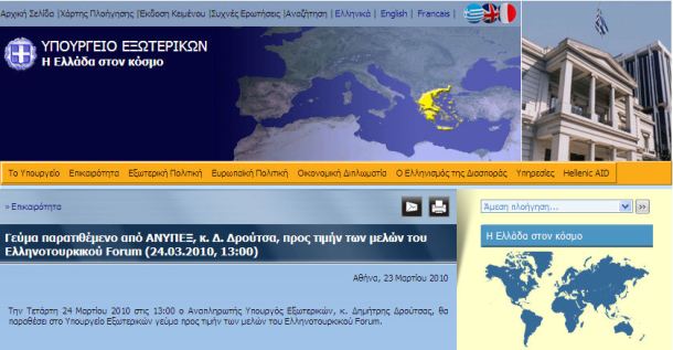 …το Υπουργείο Εξωτερικών μέσω της ιστοσελίδας του, μας ενημερώνει για το προγραμματισμένο γεύμα που σήμερα το μεσημέρι, ο Αναπληρωτής Υπουργός Εξωτερικών, κ. Δημήτρης Δρούτσας, παρέθεσε προς τιμήν των μελών του Ελληνοτουρκικού Forum.