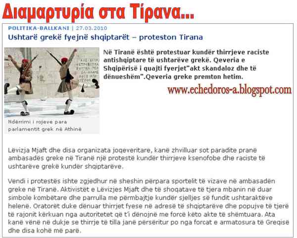 «Συγκέντρωση διαμαρτυρίας, για τα συνθήματα που ακούστηκαν από τους Έλληνες άνδρες των ΟΥΚ, διοργάνωσε σήμερα το κόμμα τον τσάμηδων (PDU) μπροστά από την Ελληνική Πρεσβεία στα Τίρανα.Στη συγκέντρωση συμμετείχαν και οι δυο βουλευτές του PDU Σπετίμ Ιντρίζι και Ντσαμίρ Ταχίρι.Οι συγκεντρωμένοι έκαψαν Ελληνική Σημαία όπου επάνω της ήταν γραμμένο το όνομα του Πρόεδρου της ΟΜΟΝΟΙΑΣ και δήμαρχου Χιμάρας Βασίλη Μπολάνου.Σε τεράστια πανώ οι διαδηλωτές είχαν γράψει συνθήματα όπως …