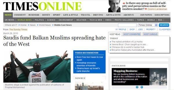 «Η Σαουδική Αραβία ρίχνει εκατοντάδες εκατομμύρια λίρες σε ισλαμικές ομάδες στα Βαλκάνια, ορισμένες εκ των οποίων σπέρνουν μίσος κατά της Δύσης και προετοιμάζουν μαχητές ως τζιχάντ στο Αφγανιστάν». Τα παραπάνω αναφέρει στη σημερινή της έκδοση (28.3.10) η εφημερίδα Sunday Times, με πληροφορίες που έλαβε από την ΠΓΔΜ.