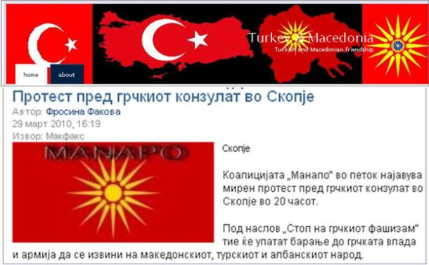 Ο συνασπισμός «Manapo» των Σκοπίων διοργανώνει ειρηνική διαμαρτυρία, μπροστά από το ‘ελληνικό προξενείο’ όπως γράφει, στην πόλη των Σκοπίων την ερχόμενη Παρασκευή στις 8 το βράδυ. Η διαμαρτυρία έχει τίτλο «Στοπ στον ελληνικό φασισμό» („Стоп на грчкиот фашизам“) και οι διαμαρυρόμενοι θα επιδώσουν ψήφισμα προς την ελληνική κυβέρνηση και το στρατό με το αίτημα να ζητήσουν συγνώμη από τον Σκοπιανό, Τουρκικό και Αλβανικό λαό.