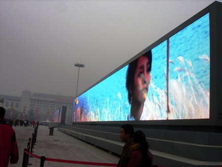 Για τους εορτασμούς στην πλατεία στήθηκαν επίσης τεράστια video walls όπου προβάλλονται εντυπωσιακές εικόνες τηςσύγχρονης Κίνας. Από τουςξεναγούς μας μάθαμε ότι γίνονται συζητήσεις για το αν θα μείνουν για πάντα εκεί ή θα απομακρυνθούν σε εύλογο χρονικό διάστημα.