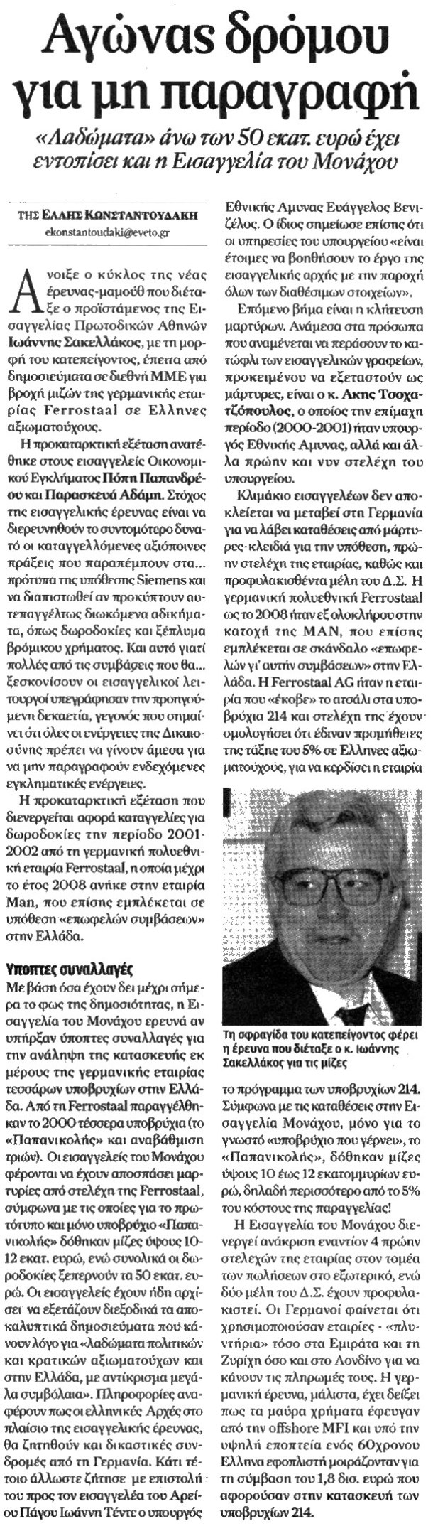 Αγώνας δρόμου για μη παραγραφή. Posted on 11 Απριλίου, 2010 by Λουκάς Σχολιάστε «Λαδώματα» άνω των 50 εκατ ευρώ έχει εντοπίσει και η Εισαγγελία του Μονάχου. Εξετάζεται η αγορά του υποβρυχίου «Παπανικολής» και η αναβάθμιση των τριων άλλων. ΕΦΗΜΕΡΙΔΑ: VETO – ΣΕΛ. 21 Κοινοποιήστε:Tweet Κλικ για αποστολή ενός συνδέσμου μέσω email σε έναν/μία φίλο/η(Ανοίγει σε νέο παράθυρο) Email Κλικ για εκτύπωση(Ανοίγει σε νέο παράθυρο) Εκτύπωση Μου αρέσει! Φόρτωση... Σχετικά