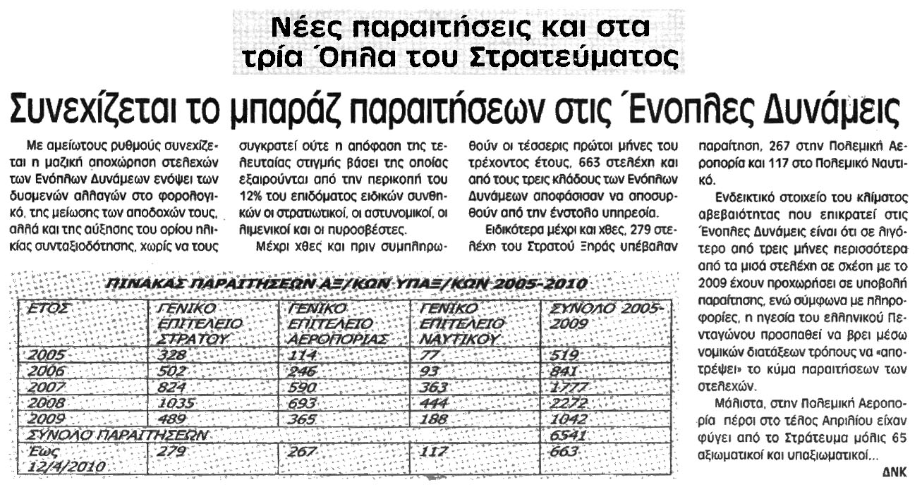 Συνεχίζεται το μπαράζ παραιτήσεων στις Ένοπλες Δυνάμεις. Posted on 13 Απριλίου, 2010 by Λουκάς Σχολιάστε Κλικάρετε την εικόνα για μεγένθυση Εφημερίδα: ΕΛΕΥΘΕΡΟΣ – ΣΕΛ.23 Κοινοποιήστε:Tweet Κλικ για αποστολή ενός συνδέσμου μέσω email σε έναν/μία φίλο/η(Ανοίγει σε νέο παράθυρο) Email Κλικ για εκτύπωση(Ανοίγει σε νέο παράθυρο) Εκτύπωση Μου αρέσει! Φόρτωση... Σχετικά