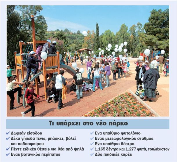 Η ανάπλαση άρχισε το 2008, με προϋπολογισμό σχεδόν 9 εκατ. ευρώ, και το νέο πάρκο εγκαινιάστηκε χθες. Στις εγκαταστάσεις περιλαμβάνονται συνολικά δέκα γήπεδα για τένις, μπάσκετ, βόλεϊ και ποδόσφαιρο (5×5), στα οποία η είσοδος είναι δωρεάν. Επιπλέον χαράχτηκαν ειδικές χωμάτινες διαδρομές για τρέξιμο. Πρόκειται για διαδρομές ειδικά οριοθετημένες, με σήμανση για τις αποστάσεις και τις κλίσεις του εδάφους. Με ανάλογη σήμανση οριοθετούνται και οι διαδρομές που είναι καταλληλότερες για να τρέχουν άτομα που αντιμετωπίζουν προβλήματα υγείας.