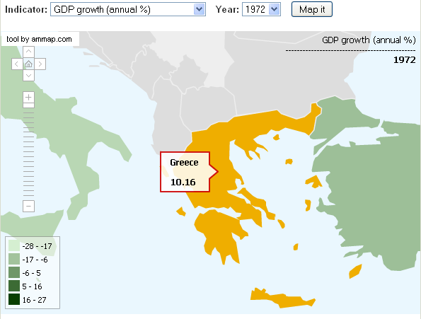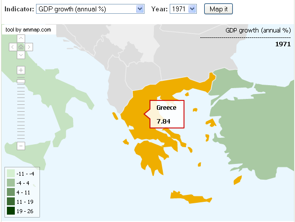 Τα πιο κάτω διαγράμματα από την Παγκόσμια Τράπεζα (World Bank) δείχνουν τους ρυθμούς ανάπτυξης της Ελλάδος εκείνη την περίοδο