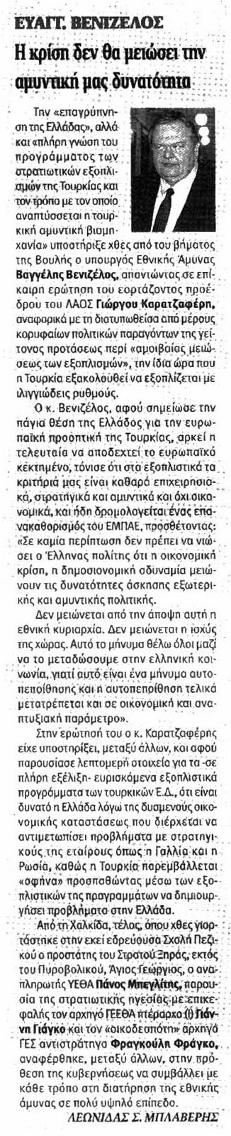 Ευάγγελος Βενιζέλος: Η κρίση δεν θα μειώσει την αμυντική μας δυνατότητα. Posted on 24 Απριλίου, 2010 by Λουκάς Σχολιάστε ΑΠΟΓΕΥΜΑΤΙΝΗ – ΣΕΛ.4 Κοινοποιήστε:Tweet Κλικ για αποστολή ενός συνδέσμου μέσω email σε έναν/μία φίλο/η(Ανοίγει σε νέο παράθυρο) Email Κλικ για εκτύπωση(Ανοίγει σε νέο παράθυρο) Εκτύπωση Μου αρέσει! Φόρτωση... Σχετικά