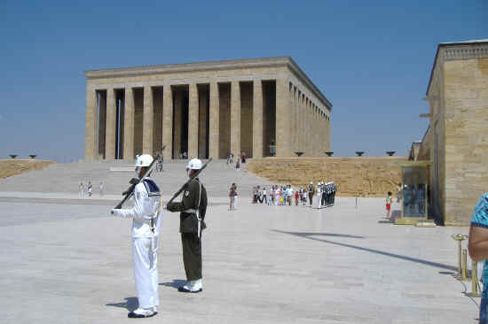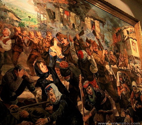 Στο πιο εντυπωσιακό και προβεβλημένο σημείο αναφορά στο μαυσωλείο του Κεμάλ Ατατούρκ στην Άγκυρα όπου καταλήγουν ηγέτες γίνονται τελετές επίσημες, επισκέψεις, καταθέσεις στεφάνων, υπάρχει στον χώρο ξενάγησης στην πρώτη αίθουσα μια ιδιαίτερα αποτροπιαστική εικονογράφηση από την μικρασιατική καταστροφή όπου παρουσιάζονται οι Έλληνες ως αιμοσταγείς και μάλιστα Έλληνας στρατιώτης λογχίζει έγκυο Τουρκάλα!