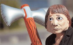 Ακτιβίστρια της κίνησης κατά της παγκοσμιοποίησης Αttac με τη μάσκα της Ανγκελα Μέρκελ και ένα πλαστικό τσεκούρι συμμετέχοντας στις διαδηλώσεις έξω από την καγκελαρία στο Βερολίνο εναντίον των μέτρων που επέβαλαν Ε.Ε. και Γερμανία στην ΕλλάδαΣτη γερμανική Βουλή εισήχθη χθες με τη διαδικασία του επείγοντος το νομοσχέδιο για τις κρατικές εγγυήσεις της Γερμανίας στις πιστώσεις προς την Ελλάδα. Η ψηφοφορία θα πραγματοποιηθεί την Παρασκευή, αλλά η κυβέρνηση της Μέρκελ έχει δυσκολίες να αποσπάσει τη συναίνεση των κομμάτων της αντιπολίτευσης.