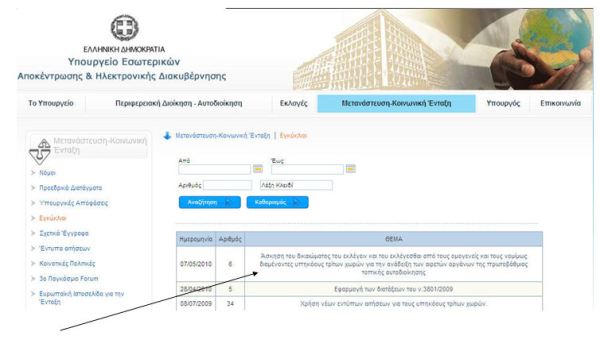 Άσκηση του δικαιώματος του εκλέγειν και του εκλέγεσθαι από τους ομογενείς και τους νομίμως διαμένοντες υπηκόους τρίτων χωρών για την ανάδειξη των αιρετών οργάνων της πρωτοβάθμιας τοπικής αυτοδιοίκησης. Posted on 9 Μαΐου, 2010 by Λουκάς Σχολιάστε Κλικάρετε την εικόνα καταρχήν και μετά κλικάρετε το (link) που δείχνει το βέλος ώστε να δείτε όλοκληρη τη σχετική εγκύκλιο που έχει αναρτηθεί στο Υπουργείο Εσωτερικών. Κοινοποιήστε:Tweet Στείλε ένα σύνδεσμο σε έναν φίλο(Ανοίγει σε νέο παράθυρο) Email Εκτύπωση(Ανοίγει σε νέο παράθυρο) Εκτύπωση Μου αρέσει! Φόρτωση... Σχετικά