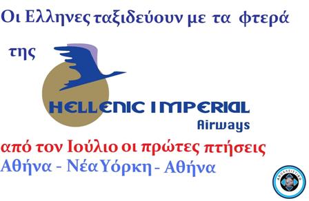 Οι έλληνες της Αμερικής από τον Ιούλιο θα μπορούν και πάλι να πετάνε προς την πατρίδα με τα φτερά της Hellenic Imperial Airways. Μια νέα, μεγάλη και ταχέως αναπτυσσόμενη εταιρία με ελληνικά και διεθνή κεφάλαια που επενδύει στις αεροπορικές μεταφορές αλλά και άλλες παράλληλες επιχειρηματικές δράσεις όπως οι πτήσεις charter επενδύει σε μια εθνική προσπάθεια ιδιαίτερα αυτή την κρίσιμη εθνικά για την Ελλάδα περίοδο.
