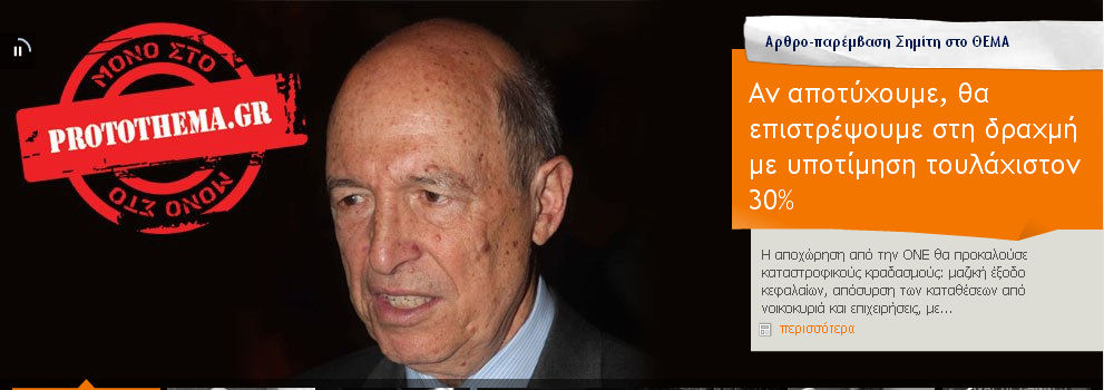 Αρκεί, όπως τονίζει με έμφαση, να υπάρξει θέληση, αποφασιστικότητα και ταχύτητα αντιδρά σεων και η αντιμετώπιση των προβλημάτων να γίνεται με γνώμονα τη βελτίωση της πορείας της χώρας και όχι το πολιτικό κόστος. Ο κ. Κώστας Σημίτης στο άρθρο του επισημαίνει ότι η έξοδος από την ΟΝΕ θα είναι καταστροφική, η υποτίμηση της δραχμής θα είναι άνω του 30% και η επιστροφή σε αυτήν ολέθρια, ενώ τονίζει ότι πρέπει να επιστραφούν ο 13ος και 14ος μισθός στους συνταξιούχους.