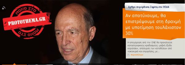 Ανεξάρτητα αν συμφωνει κανείς η όχι σε όλα με τις απόψεις του πρωην Πρωθυπουργού,ο τίτλος του αρθρου είναι τελείως παραπλανητικός και αυθαίρετος και εκφραζει τις απόψεις του αρχισυντακτου και όχι του αρθρογράφου που τονιζει οτιΗ έξοδος από την ΟΝΕ θα έπληττε καίρια την αξιοπιστία μας, τις εξωτερικές οικονομικές μας σχέσεις,»η έξοδος από την ΟΝΕ θα είναι καταστροφική, «