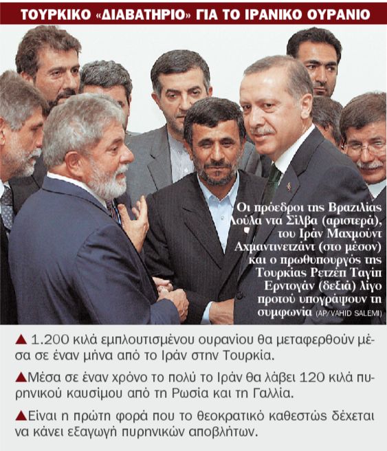 ΤΕΧΕΡΑΝΗ. Με δυσπιστία υποδέχθηκε η Ουάσιγκτον την πυρηνική συμφωνία που επιτεύχθηκε χθες στην Τεχεράνη ανάμεσα στην Τουρκία και στο Ιράν. Πρόκειται για συμφωνία εξαγωγής ιρανικού εμπλουτισμένου ουρανίου στην Τουρκία με στόχο τη μελλοντική επεξεργασία του (σε άλλη χώρα όπως η Ρωσία και η Γαλλίαη Τουρκία δεν διαθέτει τέτοια δυνατότητα) και τη μετατροπή του σε πυρηνικό καύσιμο για ειρηνικούς σκοπούς.