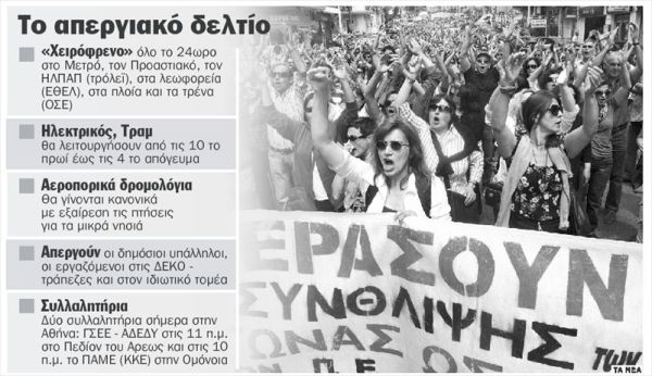 Σε απεργιακό κλοιό βρίσκεται σήμερα η χώρα λόγω της 24ωρης πανεργατικής απεργίας που οργανώνουν ΓΣΕΕ και ΑΔΕΔΥ κατά των οικονομικών μέτρων και των ανατροπών στο Ασφαλιστικό. Σε εξέλιξη βρίσκεται η απεργιακή συγκέντρωση της ΓΣΕΕ και της ΑΔΕΔΥ που ξεκίνησε στις 11 το πρωί στο Πεδίον του Αρεως. Ξεχωριστή συγκέντρωση πραγματοποιεί από τις 10 το πρωί στην Πλατεία Ομονοίας το ΠΑΜΕ (ΚΚΕ).
