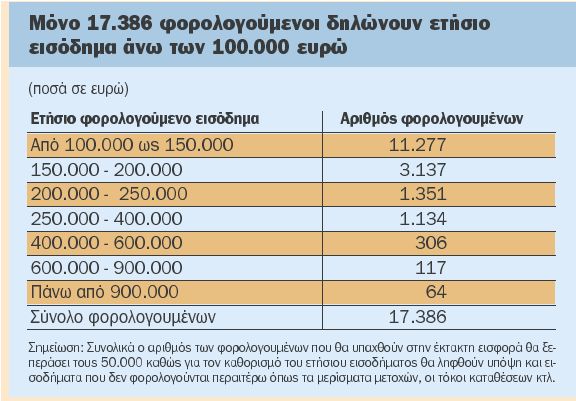 Εκτακτη εισφορά 1% επί των συνολικών εισοδημάτων τους θα κληθούν να πληρώσουν στην Εφορία όσοι δηλώσουν εφέτος περισσότερα από 100.000 ευρώ. Στα έσοδα για τον προσδιορισμό του εισοδήματος όπου θα επιβληθεί η έκτακτη εισφορά θα ληφθούν υπόψη και οι τόκοι καταθέσεων, οι υπεραξίες από αγοραπωλησίες μετοχών, τα κέρδη από αμοιβαία κεφάλαια, καθώς και εισοδήματα που φορολογούνται αυτοτελώς ή με ειδικό τρόπο. Σύμφωνα με στοιχεία, ατομικό φορολογητέο εισόδημα άνω των 100.000 ευρώ δηλώνουν μόλις 17.386 φορολογούμενοι.