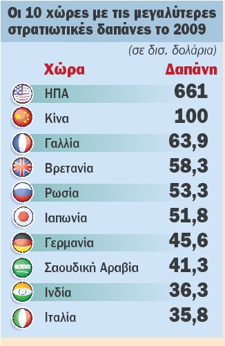 Παρά την οικονομική κρίση (ίσως εν μέρει και εξαιτίας της) οι παγκόσμιες στρατιωτικές δαπάνες συνέχισαν να αυξάνονται με εντυπωσιακούς ρυθμούς το 2009. Σύμφωνα με την ετήσια έκθεση για τους εξοπλισμούς του Διεθνούς Παρατηρητηρίου της Στοκχόλμης για την Ειρήνη (SΙΡRΙ), φθάνουν στα 1,531 τρισ. δολάρια.