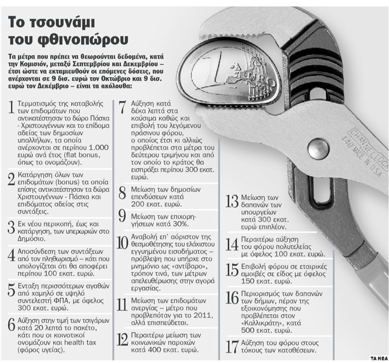 Τσουνάμι νέων πρόσθετων μέτρων αναμένεται να ανακοινώσει η ελληνική κυβέρνηση τον ερχόμενο Νοέμβριο, εφ΄ όσον υπάρξουν αποκλίσεις στο Πρόγραμμα που έχει υπογράψει με το ΔΝΤ, την Κομισιόν και την Ευρωπαϊκή Κεντρική Τράπεζακαι να διασφαλίσει έτσι την απρόσκοπτη εκταμίευση των δόσεων που προβλέπει το ίδιο Πρόγραμμα.