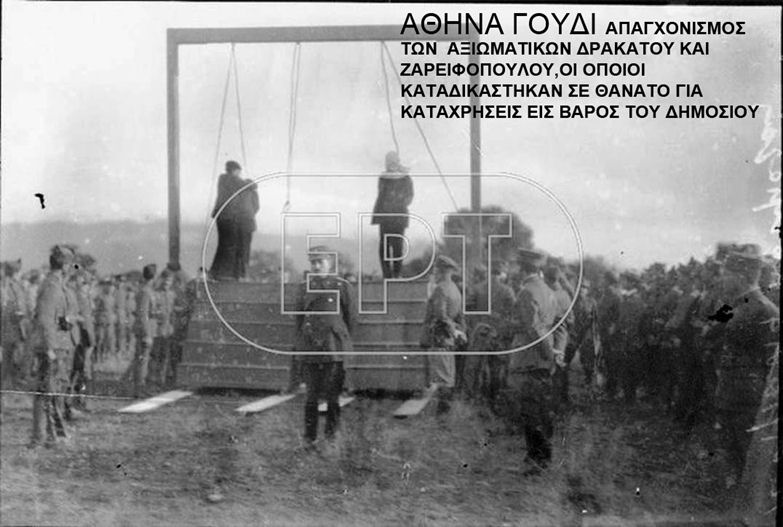 Αθήνα, πάρκο Γουδή, 28 Νοεμβρίου 1925: Στην φωτογραφία επάνω βλέπετε δύο καταχραστές του δημοσίου να θανατώνονται δι’ απαγχονισμού, μετά από καταδίκη για καταχρήσεις.