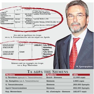 Τη σχετική λίστα, στην οποία όμως δεν αναφέρονται πολιτικά πρόσωπα, παρέδωσε χθες στην Εξεταστική Επιτροπή ο ειδικός γραμματέας της υπηρεσίας κ. Ι. Καπελέρης και προήλθε από την κατάσχεση εγγράφων που έκανε συνεργείο του ΣΔΟΕ από τα γραφεία της Siemens Ηellas μόλις πριν από λίγες ημέρες. Εντοπίστηκαν όμως ονόματα που είχαν σβηστεί με «μπλάνκο» ή με άγνωστους αποδέκτες δώρων που είτε λειτούργησαν ως «ενδιάμεσοι» πολιτικών προσώπων είτε απλώς εμπίπτουν στην κατηγορία των εταιρικών σχέσεων που διατηρούσε η γερμανική πολυεθνική. Τα ποσά εκκινούν από 50 ευρώ και φτάνουν τις 5.000 ευρώ, ενώ από την αποκρυπτογράφηση που έγινε οι μοναδικές αναφορές σε πρόσωπα που έχουν σχέση με πολιτικούς είναι στον άνθρωπο της φρουράς του πρώην υπουργού του ΠαΣοΚ κ. Α. Τσοχατζόπουλου , κ. Δ. Πατσάκη , και στη θυγατέρα του πρώην πρωθυπουργού κ. Κων.