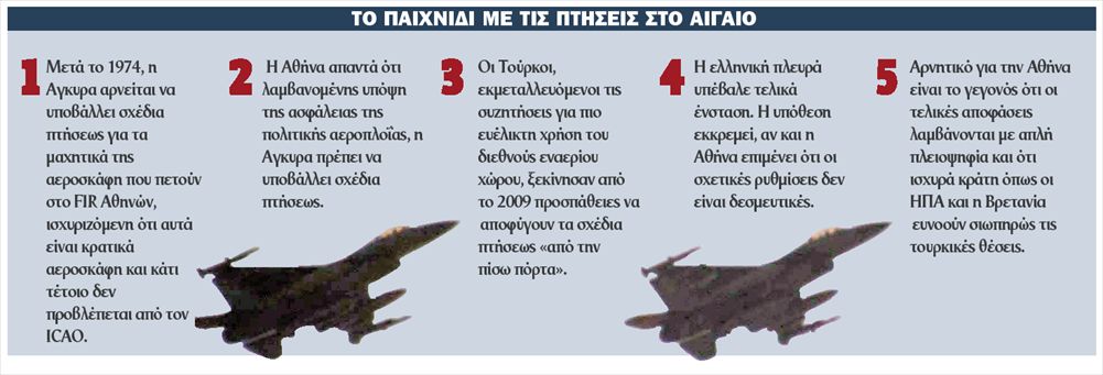Σκληρή παρτίδα στη διπλωματική σκακιέρα για τις πτήσεις στο Αιγαίο βρίσκεται σε εξέλιξη μεταξύ Ελλάδας και Τουρκίας. Η Αγκυρα προσπαθεί «από την πίσω πόρτα» και μέσω του Διεθνούς Οργανισμού Πολιτικής Αεροπορίας (ΙCΑΟ) να παρακάμψει το ελληνικό αίτημα για υποβολή σχεδίων πτήσεως για τα στρατιωτικά αεροσκάφη της που πετούν στον διεθνή εναέριο χώρο του Αιγαίου.
