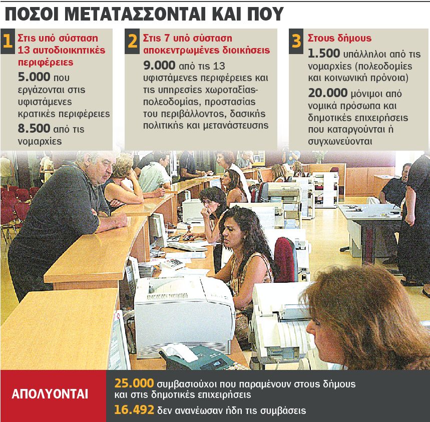 «Καυτός» θα είναι ο μήνας Ιούλιος για πάνω από 80.000 εργαζομένους στις νομαρχίες, στις περιφέρειες, στους δήμους και στα υπουργεία. Πρόκειται για τους δημόσιους υπάλληλους οι οποίοι θα κληθούν μέσα σε διάστημα ενός μηνός να επιλέξουν σε ποια νεοσυσταθείσα (με τον «Καλλικράτη») υπηρεσία θα ήθελαν να μεταταγούν, προτού το πράξουν έτσι και αλλιώς μέσω των υποχρεωτικών μετατάξεων που θα ακολουθήσουν.
