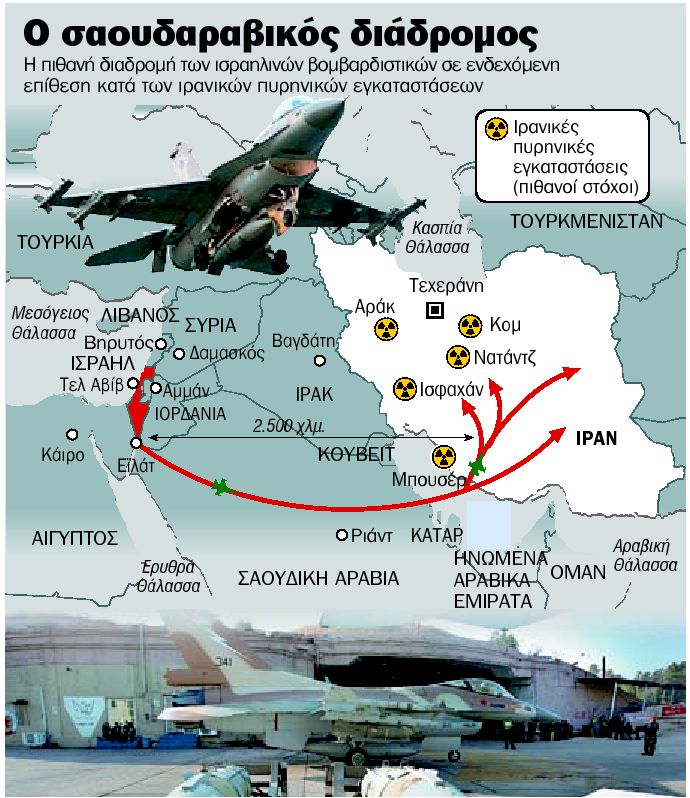 Υιοθετώντας την αρχή «ο εχθρός του εχθρού µου είναι φίλος µου», η Σαουδική Αραβία συµφώνησε να ανοίξει τον εναέριο χώρο της στο Ισραήλ, επιτρέποντάς του να χρησιµοποιήσει έναν στενό αεροδιάδροµο στα βόρεια, για ενδεχόµενη επίθεση στις πυρηνικές εγκαταστάσεις του Ιράν. Διεξήγαγε µάλιστα και δοκιµές πρόσκαιρης απενεργοποίησης της αεράµυνάς της.