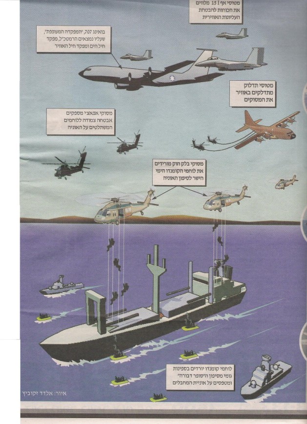 Η επιχείρηση «Sky Wind» ανοιχτά της Γάζας, πραγματοποιήθηκε ακριβώς όπως φαίνεται στην απεικόνιση παραπάνω. Υπό την κάλυψη μαχητικών αεροσκαφών και κύριων σκαφών επιφανείας της κατηγορίας Sa’ar 5, καταδρομικές μονάδες καταλαμβάνουν το πλοίο, με διείσδυση εξ αέρος (δύο ελικόπτερα) και θαλάσσης (διάφορα ταχύπλοα σκάφη).